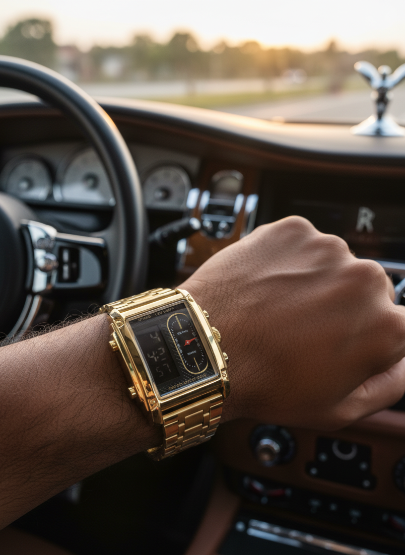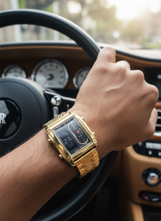 A statement of class and ambition — the Golden Legacy watch represents timeless power and precision. With its bold rectangular design, golden finish, and dual-display interface, this masterpiece blends vintage charm with modern innovation. Whether behind the wheel or making moves in life, this watch reminds you: every second counts toward greatness.